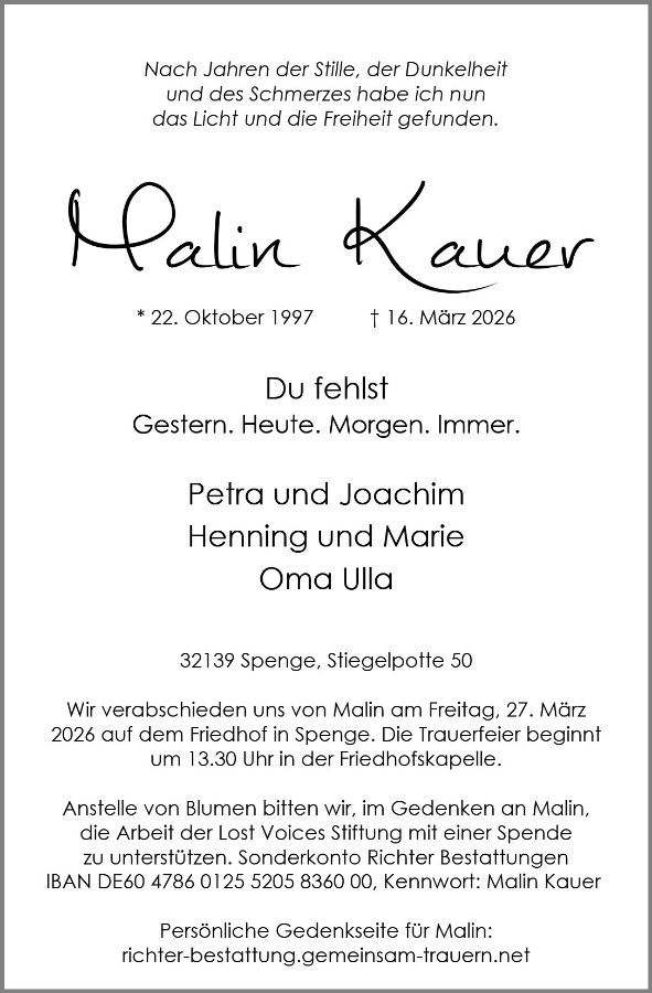 Mit großer Betroffenheit haben wir von Malins Tod erfahren. Da wir Malin noch aus unserer gemeinsamen Schulzeit kannten, trifft uns dieser Abschied besonders. Wir werden sie als einen sehr freundlichen und besonderen Menschen in Erinnerung behalten.